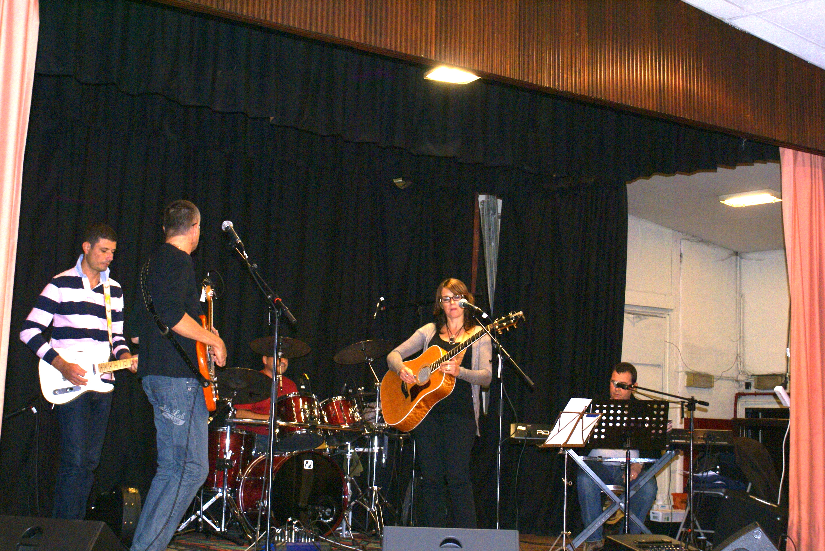 Çà groovait dur avec une super équipe autour d’Elisabeth (chant et guitare Accoustique Taylor), Eric Bourbouze (Choeurs et basse de luthier ;-), Olivier MUSSARD (énorme comme d’hab sur sa Fender Télécaster US, Emmanuel ZIEHLI (choeurs et Roland RD700) et moi même avec mes Cymbales VELVET et sur ma batterie Premier Erable made in England qui va bientôt fêter ses 22 ans, et Oui mais elle sonne grave la grand-mère 😉