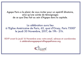 Merci de vous inscrire par email à cette adresse en y indiquant votre email de contact ainsi que votre adresse et vos coordonnées : celebrationagapeparis@agapefrance.org